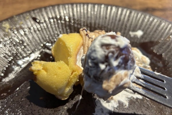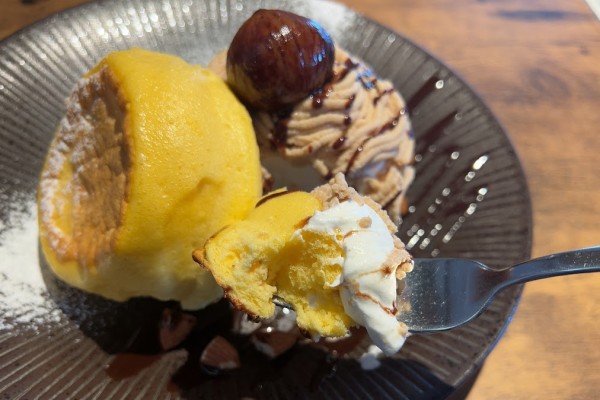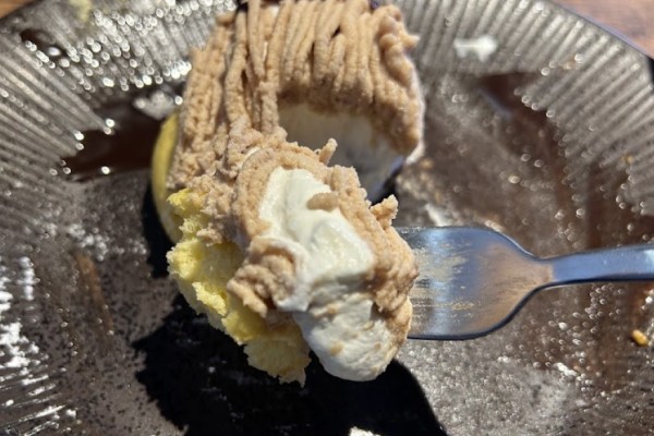 フォークを入れると、シュワッとした優しい感触が手に伝わる。 口に入れると、パンケーキの風味とモンブランの風味がしっかり感じられて、満足感が一気に満たされました。 軽い口当たりなのに、後味には栗の濃厚な余韻がしっかり残る。なかなかの本格派で満足満足!